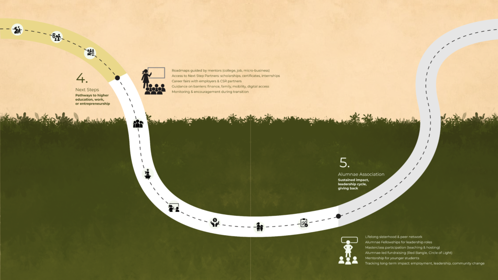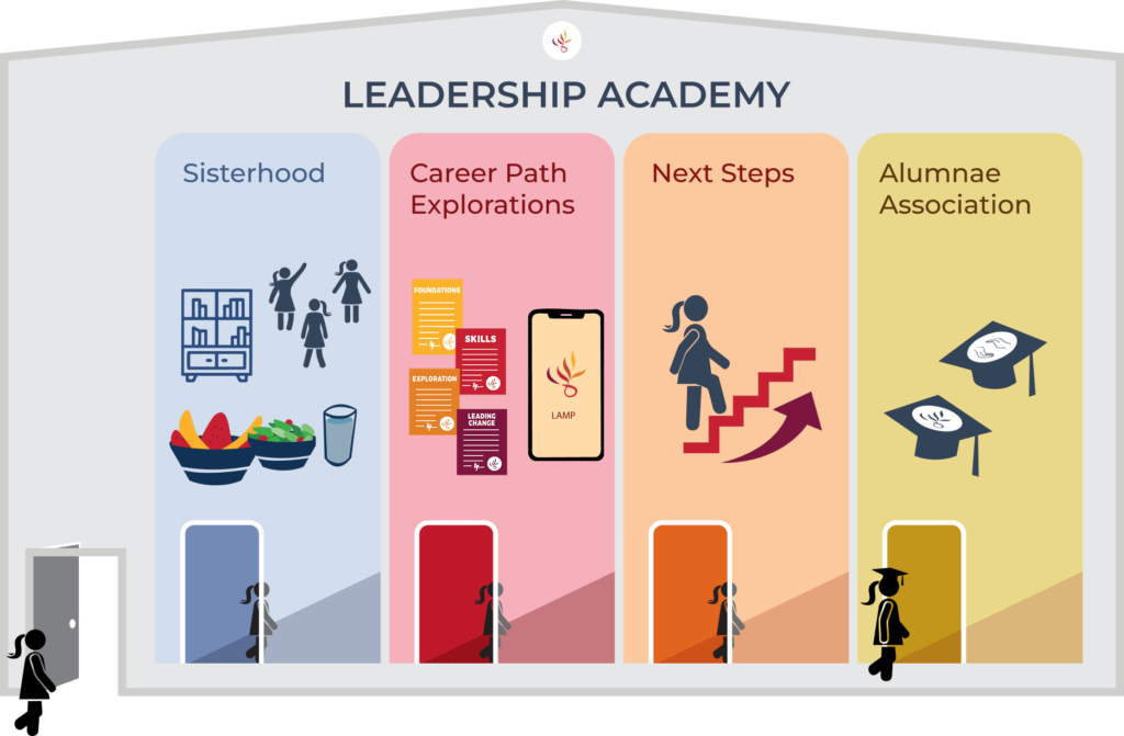 The Leadership Academy is a blended learning program that supports young women to build confidence, explore careers, and transition into higher education, employment, or entrepreneurship. The Academy runs through four core pillars that guide a young woman from entry to alumnae leadership.