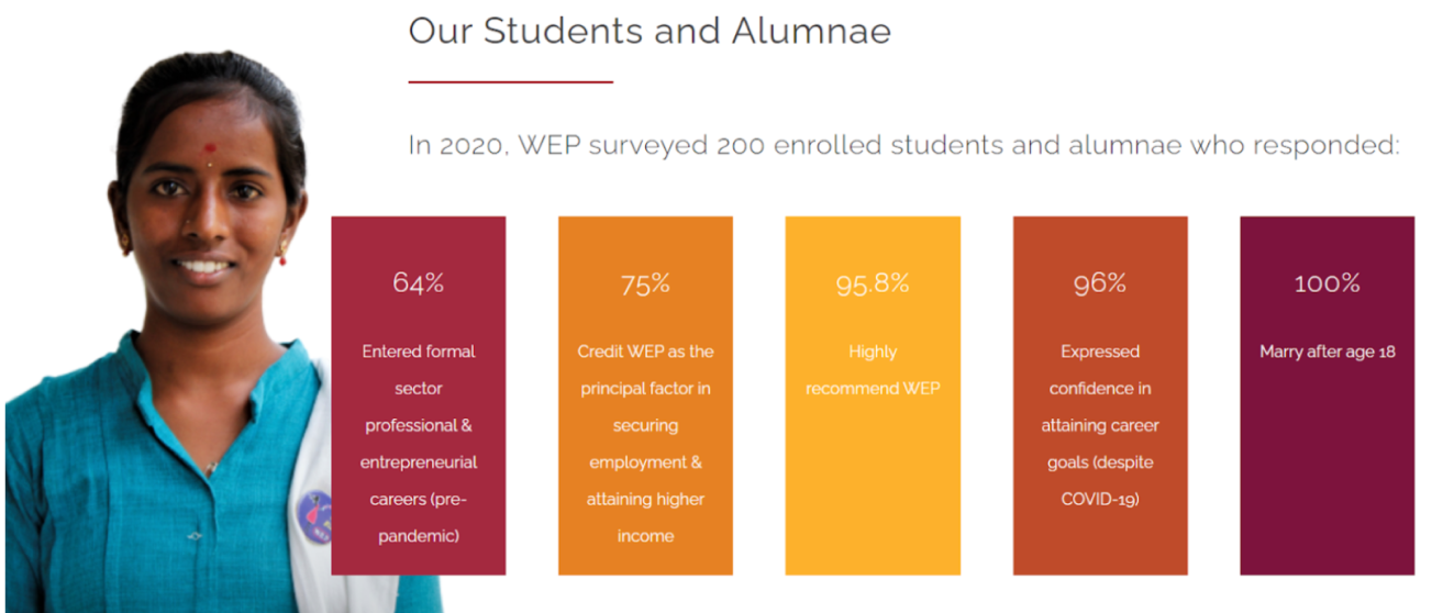 In 2020, WEP conducted a survey of 200 current students and alumni. The results were impressive: 64% of respondents had started professional or entrepreneurial careers before the pandemic, and 75% credited WEP as the main reason they secured jobs and increased their income. Additionally, 95.8% highly recommended WEP, and 95% felt confident about achieving their career goals despite the challenges of COVID-19. Notably, 100% of the women surveyed chose to marry after the age of 18.